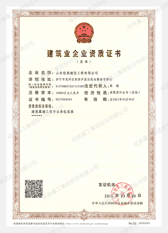 • 建筑幕墻工程專(zhuān)業(yè)承包貳級(jí)資質(zhì)