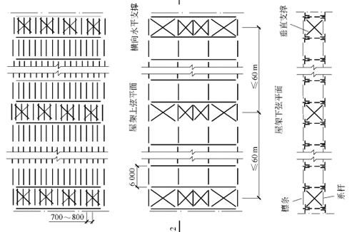 在沿廠房縱向每間隔4~6個(gè)屋架應(yīng)設(shè)置垂直支撐,以保證屋架安裝時(shí)的穩(wěn)定性。系桿在未設(shè)橫向支撐的開間,相鄰平面屋架由系桿連接。系桿通常在屋架兩端,有垂直支撐位置的上、下弦節(jié)點(diǎn)以及屋脊和天窗側(cè)柱位置,沿房屋縱向通長(zhǎng)布置。系桿對(duì)屋架上、下弦桿提供側(cè)向支承,因此必要時(shí),還應(yīng)根據(jù)控制這些弦桿長(zhǎng)細(xì)比的要求按一定距離增設(shè)中間系桿。對(duì)于有檁屋蓋,檁條可兼作系桿。