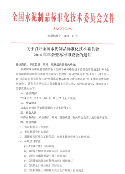 11月7日-9日全國(guó)水泥制品標(biāo)準(zhǔn)化技術(shù)委員會(huì)2014年年會(huì)暨標(biāo)準(zhǔn)審查會(huì)在山東天意機(jī)械股份有限公司隆重召開(kāi)。屆時(shí),委員會(huì)相關(guān)領(lǐng)導(dǎo)及行業(yè)相關(guān)科研人員將蒞臨會(huì)議,共同商討制訂行業(yè)有關(guān)標(biāo)準(zhǔn)。誠(chéng)邀各界人士屆時(shí)蒞臨天意機(jī)械、經(jīng)典集團(tuán)、卓越精工參觀指導(dǎo)。