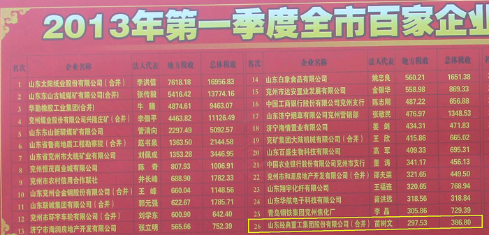 賀經(jīng)典集團進入兗州2013年第一季度納稅企業(yè)前30強