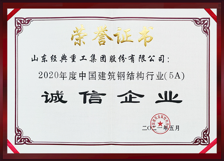 中國建筑金屬結(jié)構(gòu)協(xié)會通報2020年度建筑鋼結(jié)構(gòu)行業(yè)競爭力50強(qiáng)企業(yè),公司位列17位;榮獲2020年度中國建筑鋼結(jié)構(gòu)行業(yè)(5A)誠信企業(yè)。