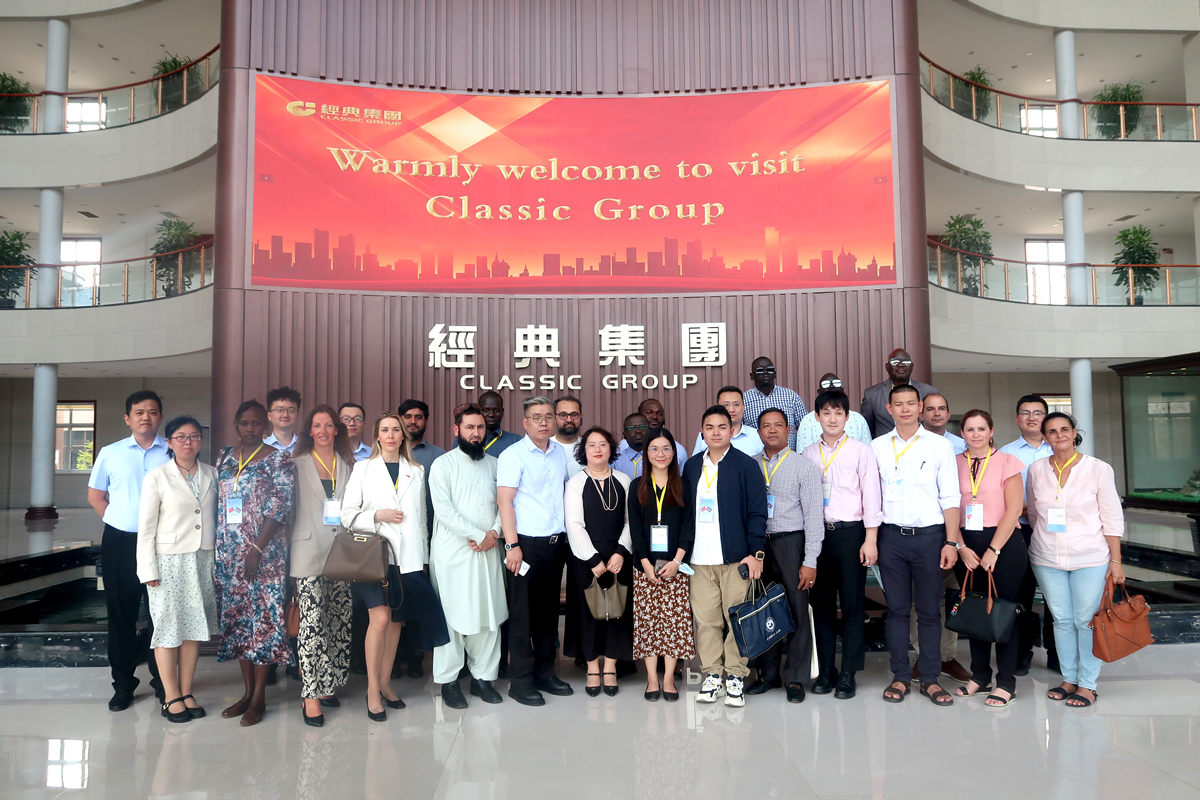 6月11日下午,由商務(wù)部主辦、山東外貿(mào)職業(yè)學院承辦的“發(fā)展中國家‘中國經(jīng)驗-中國社會制度與公共政策’研修班”一行20余人,在山東外貿(mào)職業(yè)學院援外培訓辦公室主任王保紅的帶隊下,蒞臨經(jīng)典集團參觀交流。經(jīng)典集團副總經(jīng)理兼生產(chǎn)總工張琦、副總經(jīng)理侯士輝陪同。